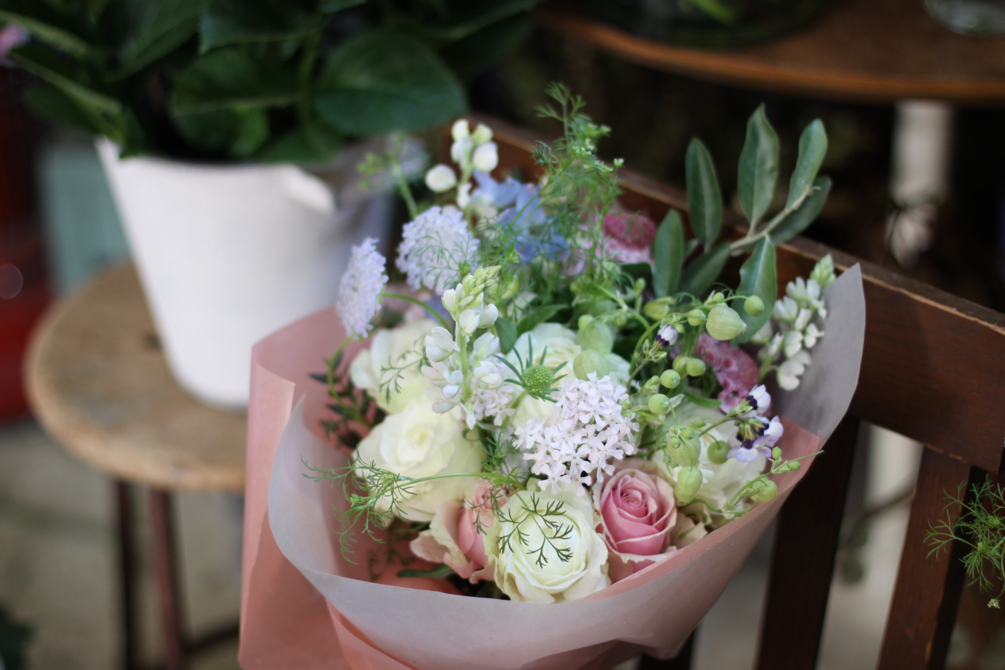入荷したて新鮮な季節のお花を色合いよく束ねます。