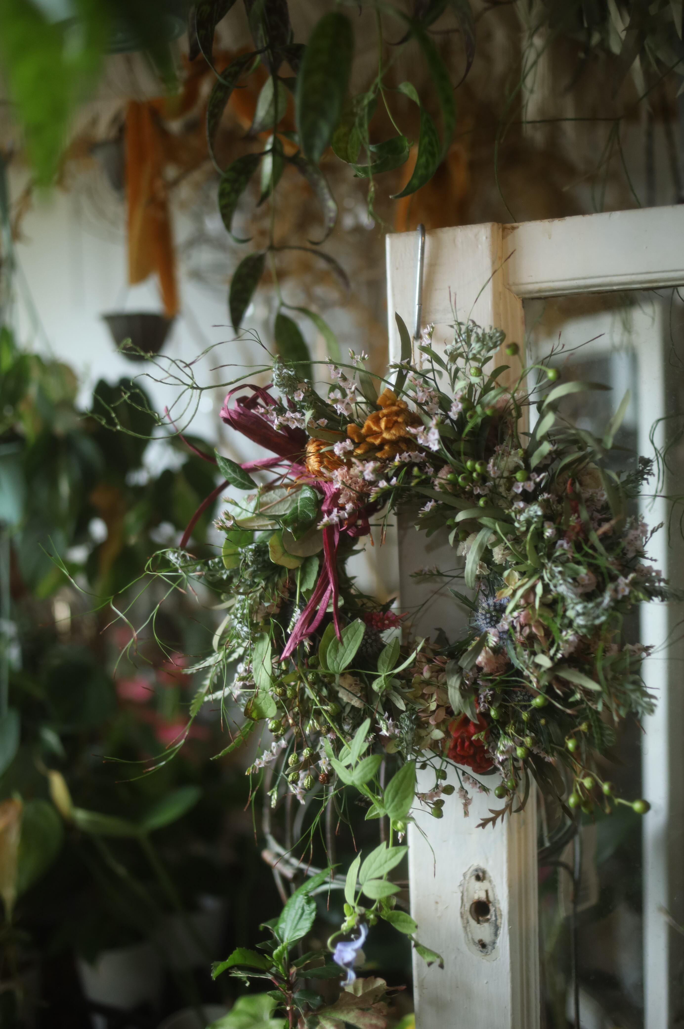 スターチースや乾いてもかわいい植物たちで組み上げた、ナチュラルなリースです。